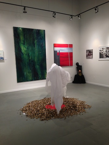 Among the work is Dean Ebben’s suite of enamel, Mylar and wood wall hangings; video artist Sofia Hager’s mind-blowing animated video of a fantasy landscape, made from 1,000 drawings; and installation artist Michelle Kaufman’s hot pink, plush sculpture that reads “Power,” evoking ideas of Feminism. Painter Jongwang Lee, who owns the nearby Space Womb gallery, is represented by a signature resin and pigment painting of swirling, layered colors, reflecting his deep interest in the spiritual. The center of the exhibit is an installation by Miguel Benavides of a suspended female figure, draped in a white cloth, and hovering above a puddle of shell cases from bullets spent.