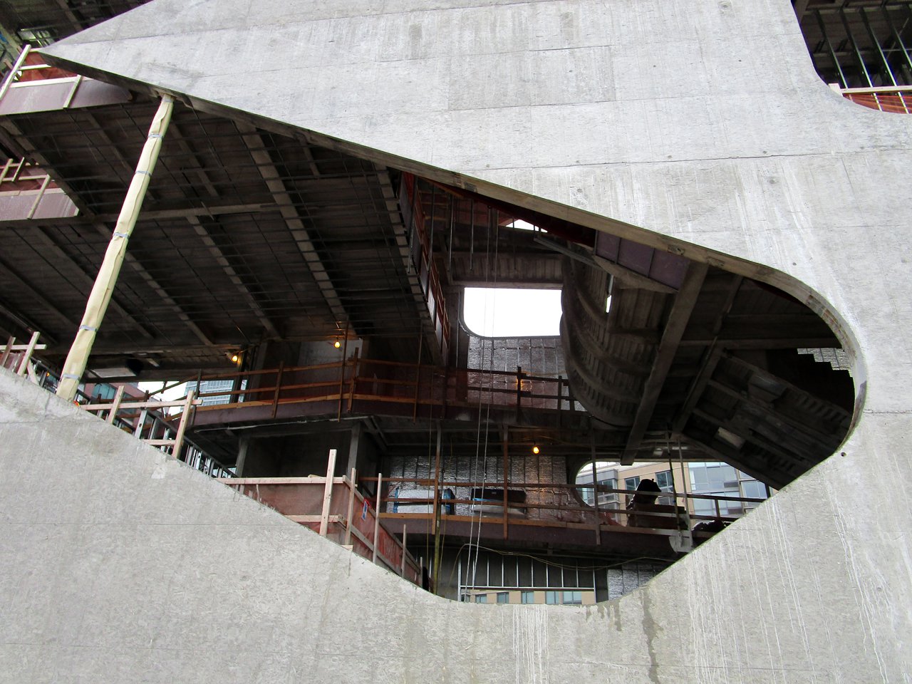 The cavernous space invites the visitor to explore and venture across the winding halls. The unfinished, irregular, dimly-lit interior felt akin to a steel-and-concrete cavern, yielding a disorienting but pleasant experience. Floors warp as they turn into walls and ceilings, mezzanines narrow into slanted catwalks, and slanted ceilings double as terraced seating on the other side.